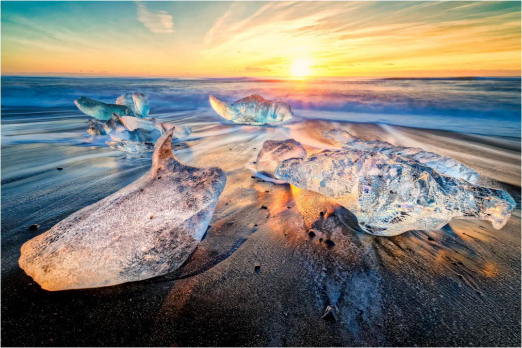 I captured this image at sunrise on Iceland’s Diamond Beach, where icebergs break off from the ancient Breiðamerkurjökull glacier, drift through the Jökulsárlón lagoon, and are eventually carried back to shore by the tide. The ice is scattered like glass across black volcanic sand. What made this moment unforgettable was the way the rising sun passed through the crystal-clear ice, lighting it from within. Born from a glacier shaped over thousands of years, these fragments are sculpted by water and waves into delicate, fleeting forms. They glowed with warmth for just a few seconds before the light shifted and the ocean reclaimed them.