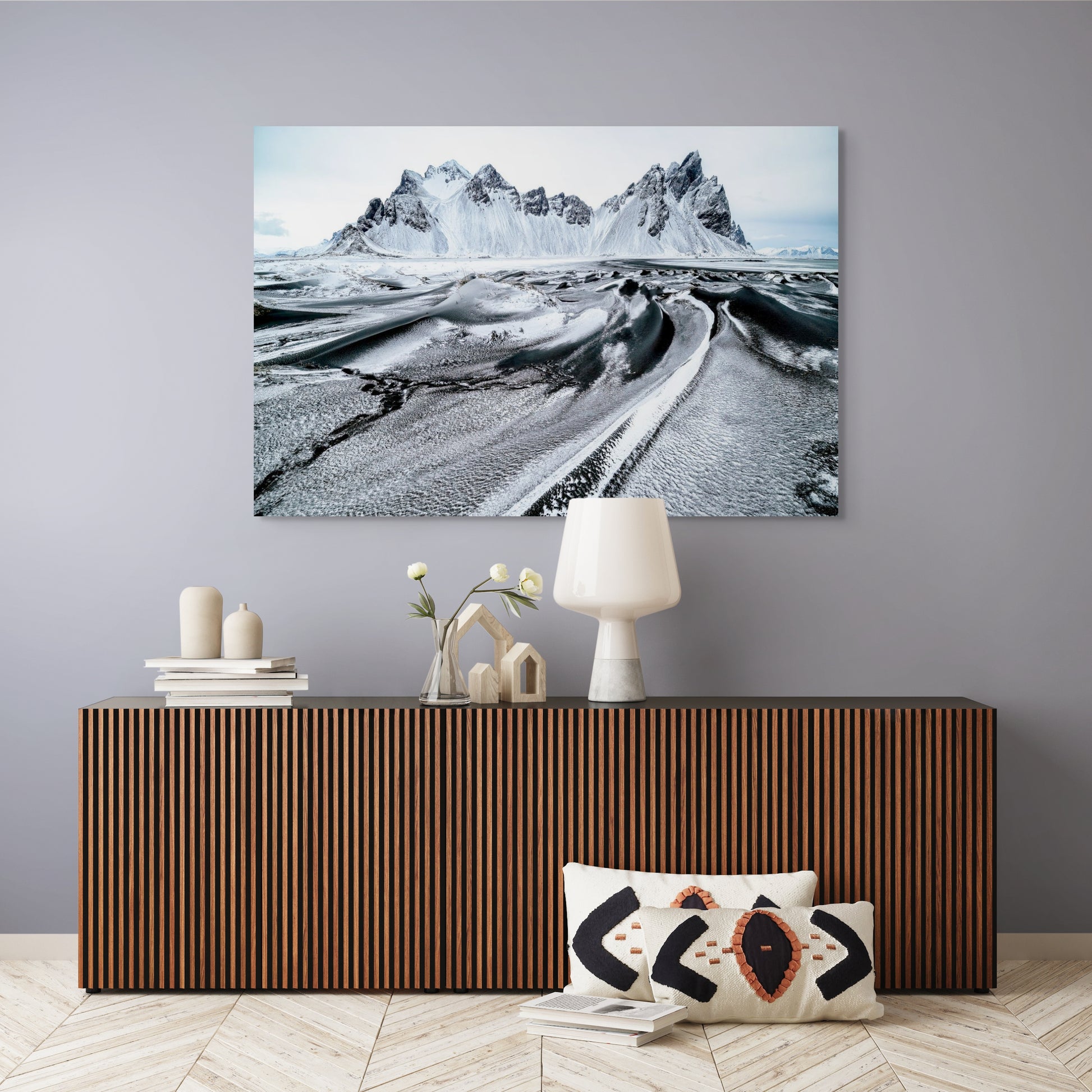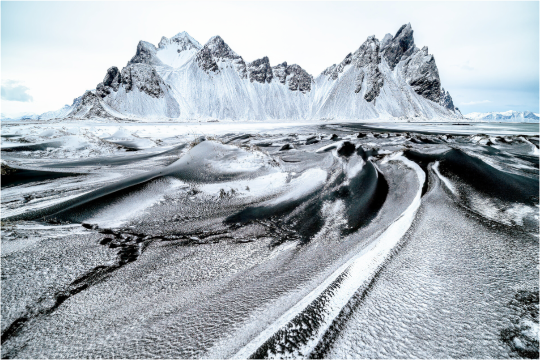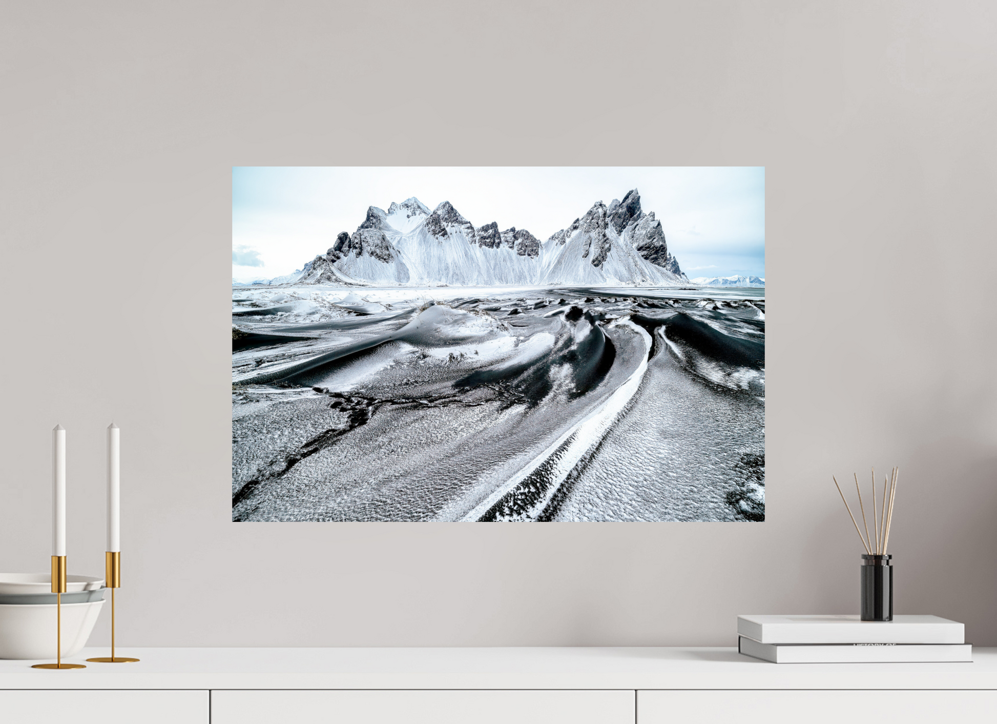 This fine art print captures the stark winter landscape of Vestrahorn, Iceland, where black volcanic dunes are carved by wind and traced with snow. I was alone on the beach when I took this image. The wind was fierce, but the scene felt strangely quiet. Muted, stripped of noise. In that moment, surrounded by nothing but shifting sand and towering peaks, I felt completely isolated, yet deeply connected to the land.